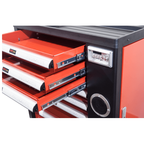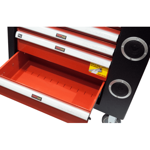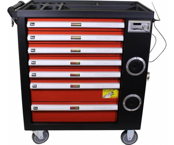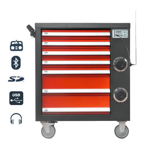 Este carro de ferramentas está equipado com 2 colunas, bluetooth, USB, leitor de cartões SD, rádio, entrada para phones e carregador.